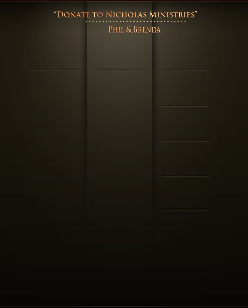 Over the years, many have asked how they could help NICHOLAS MINISTRIES (Phil and Brenda Nicholas)  do the work that God has called them to do. We always respond by saying first and foremost, "please pray" for us. Secondly, we welcome your financial gifts.